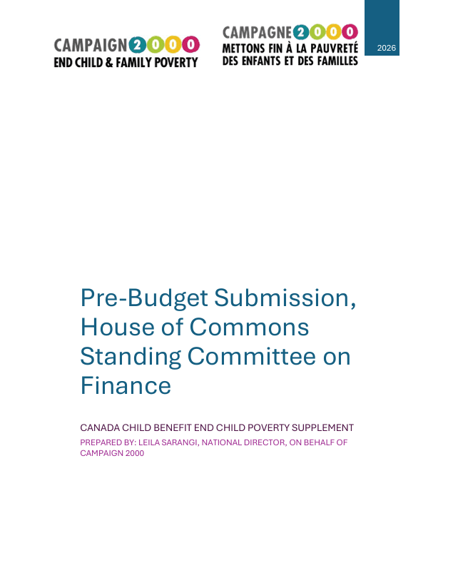 Campaign 2000’s 2026 Pre-Budget Submission to the House of Commons Standing Committee on Finance calls on the federal government to take immediate action to reduce rising child poverty in Canada. Nearly 1.4 million children are living in poverty, 2.5 million children live in food-insecure households, and families are falling an average of more than $15,000 below the low-income threshold.