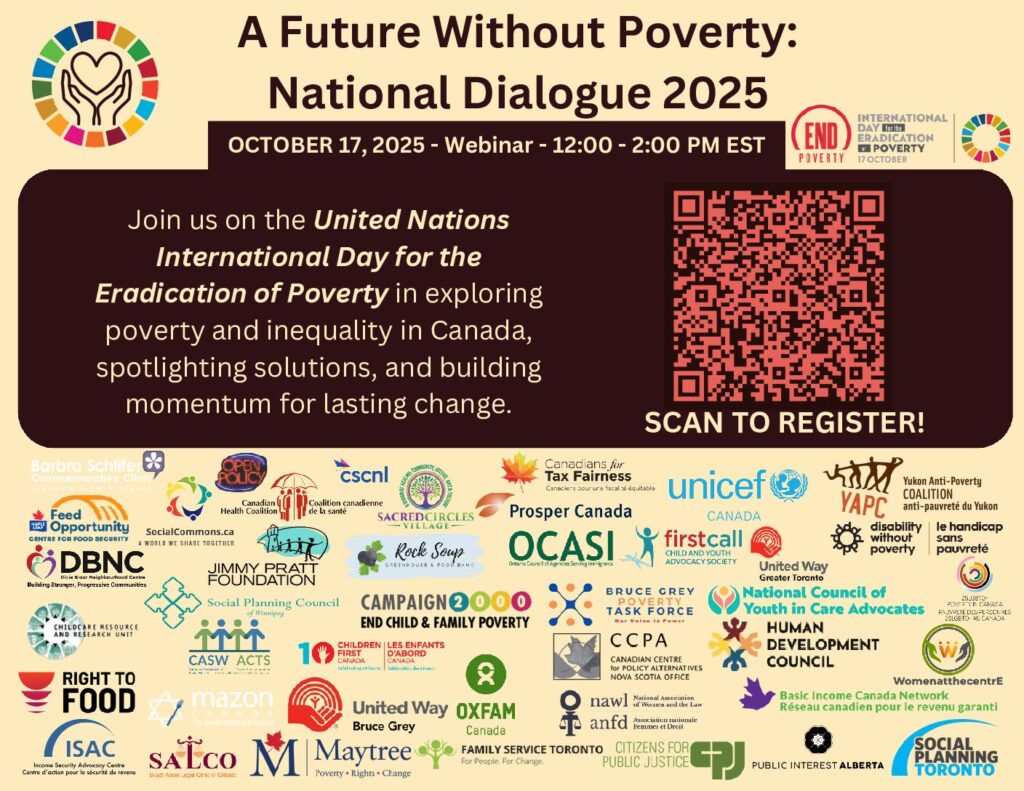 Join us on the United Nations International Day for the Eradication of Poverty for a national conversation on poverty and inequality in Canada. This virtual event will bring together organizations, advocates, and individuals from across the country to spotlight solutions, amplify voices, and build momentum for lasting change.